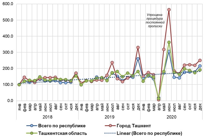 Упрощение постоянной регистрации увеличило количество заключенных договоров купли-продажи недвижимости по сравнению с соответствующим периодом 2019 года на 148,7% в Ташкенте и 26,5% в Ташкентской области, в июне — 257,5% и 190,7% соответственно.