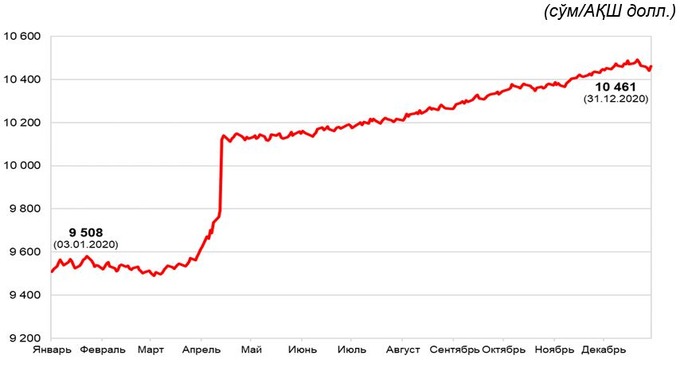 Во вторые шесть месяцев обменный курс был относительно стабильным, снизившись на 2,7%. В целом за 2020 год национальная валюта по отношению к доллару обесценилась на 10,1% (с 9 501 сумов/доллар до 10 461 сумов /доллар):