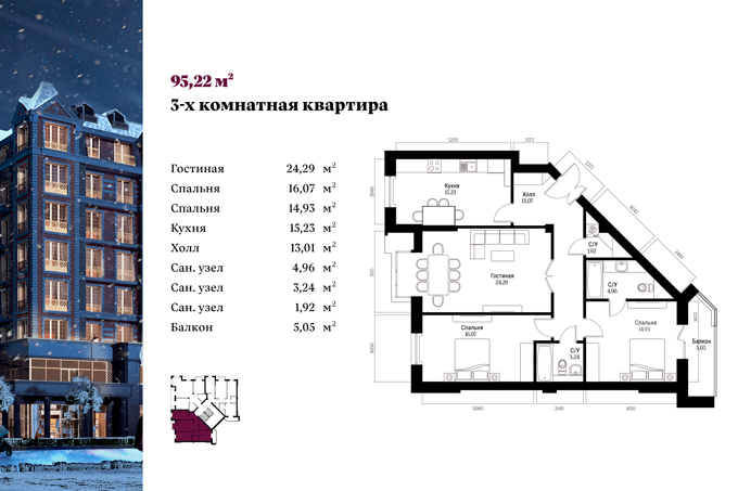 Трехкомнатная квартира площадью 95,22 кв. м с оригинальной планировкой. Здесь выполнено особенное зонирование с учетом площади и особенностей пространства. Также соблюдено правильное и эффективное соотношение общей площади к площади жилых помещений.