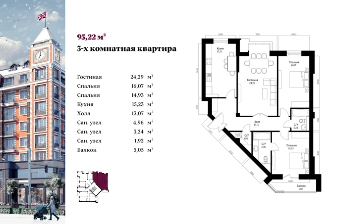 Трехкомнатная квартира площадью 92,8 кв. м с панорамными окнами. Она расположена прямо под огромными часами, которые напоминают тот самый символ Британии — часовую башню Биг-Бен.