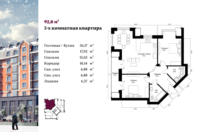 Третий тип квартиры точно такой же, как и второй, но комнаты расположены зеркальным образом. Из квартиры открывается потрясающий вид на горы и аллею британского квартала Greenwich благодаря расположению на самых верхних этажах комплекса.