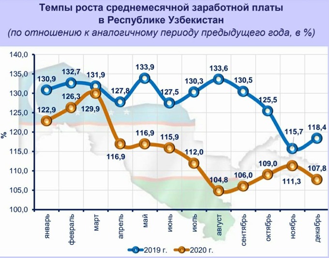 Самые высокие зарплаты в 2020 году были в сфере финансовой и страховой деятельности (6,2 млн сумов), самые низкие ― в здравоохранении и сфере социальных услуг (1,8 млн сумов).