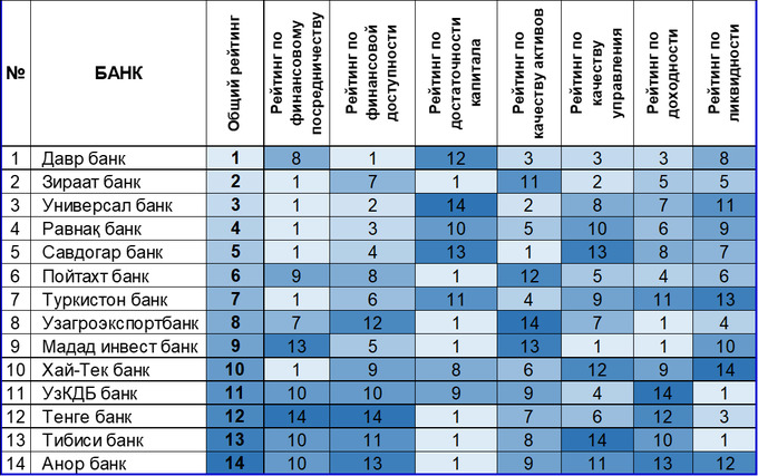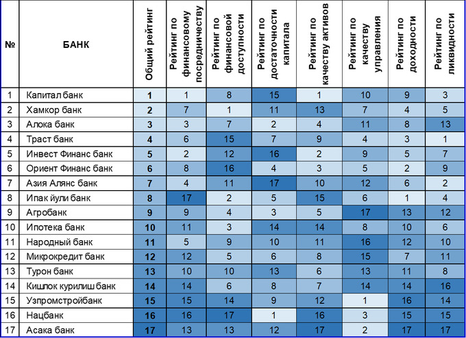 Учитывая специфику сектора, банки были разделены на две группы: крупные и малые. Для каждой из этих групп был отдельно составлен рейтинг. Первое место среди крупных банков занял «Капиталбанк», среди малых — «Даврбанк».