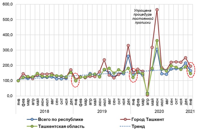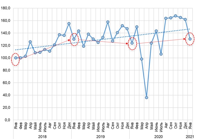 Спрос в январе 2021 года увеличился на 5,3% по сравнению с январем прошлого года. Аналитики отмечают, что динамика продаж циклична из-за множества факторов (например, снижение денежных переводов).