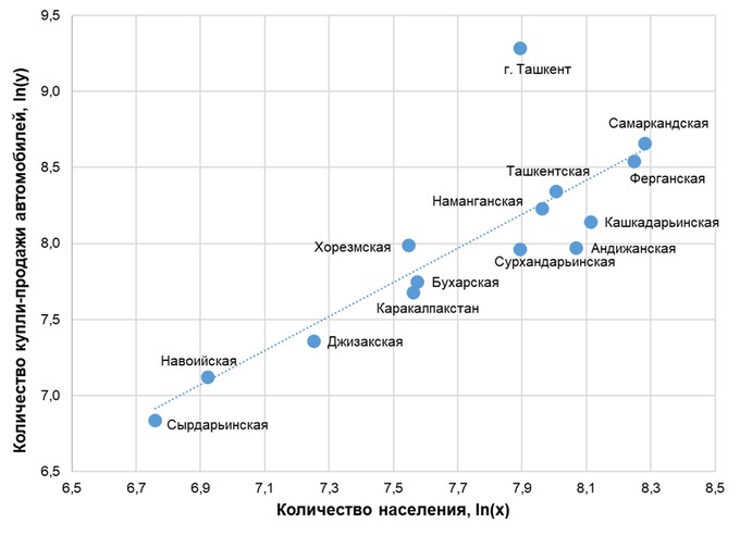 Результаты анализа показали, что увеличение населения на 1% приводит к увеличению продаж автомобилей на 1,1%: