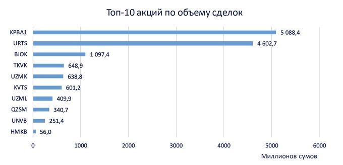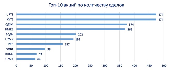 Из него следует, что больше всего сделок прошло с простыми акциями Узбекской республиканской товарно-сырьевой биржи (URTS) и «Кварца» (KVTS) — по 474. В первую пятерку также вошли простые акции «Кызылкумцент» (QZSM), «Хамкорбанк» (HMKB) и «Узпромстройбанк»: