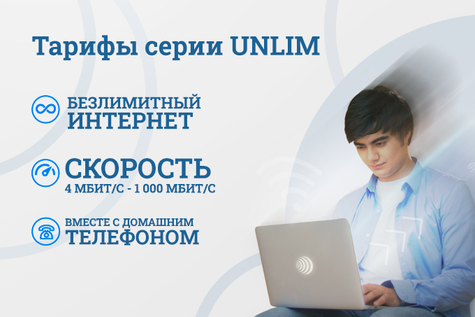 UZTELECOM сегодня предлагает выгодные, скоростные и безлимитные тарифы серии UNLIM. Удобно, что теперь эти тарифы включают в себя и домашний телефон (IP-телефония).