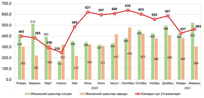 Центральный банк никак не комментирует свой отчет, но опрошенные Spot эксперты полагают, что это во многом связано с денежными переводами — в начале года их объем всегда снижается и начинает расти в марте-апреле (в прошлом году тренд был нарушен из-за начавшейся в странах-торговых партнерах пандемии). В этот период то население, у кого переводы составляют основу доходов (а таких в Узбекистане большое количество), меняют на сумы доллары, что были присланы еще во второй половине предыдущего года.