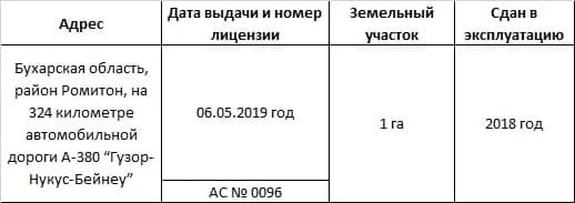 Инвесторам предлагаются действующие и строящиеся АЗС и сервисные центры, расположенные в Каганском районе Бухарской области, городе Карши Кашкадарьинской области, городе Навои и Карманинском районе Навоийской области, Ахангаранском районе Ташкентской области, городе Нукус Республики Каракалпакстан и городе Ургенч Хорезмской области.