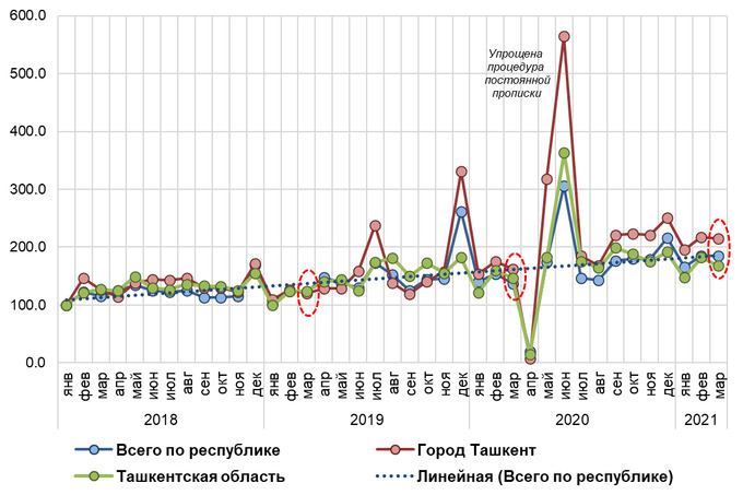 В Ташкенте, на который приходится более 30% рынка недвижимости, количество договоров купли-продажи снизилось на 0,9% по сравнению с февралем: