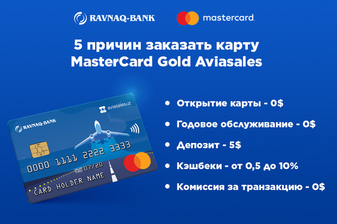 Заказать карту Mastercard можно в офисах банка и через мобильное приложение. На выбор Ravnaq-bank предлагает три вида карт Mastercard — Standart, Gold и кобрендинговая с Aviasales. Последнюю можно оформить бесплатно онлайн с доставкой на дом и кешбэком до 10%.