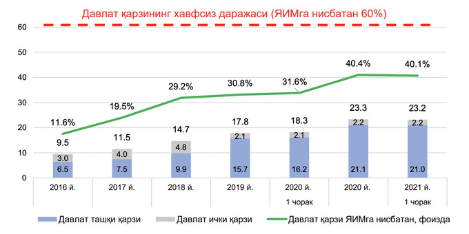 Государственный долг Узбекистана по итогам I квартала 2021 года составил $23,2 млрд или 40,1% от ВВП республики, следует из данных Министерства финансов (pdf.).