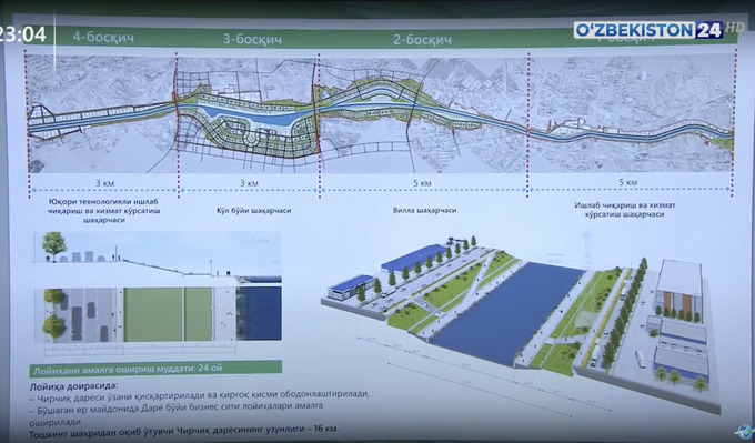 Один из проектов предусматривает строительство различных объектов инфраструктуры вдоль реки Чирчик. Протяженность участка реки, пролегающего через Ташкент, составляет 16 километров.
