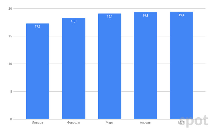 В мае средняя ставка составила 19,4%. В предыдущие четыре месяца было 17%, 18,3%, 19,1% и 19,3%:
