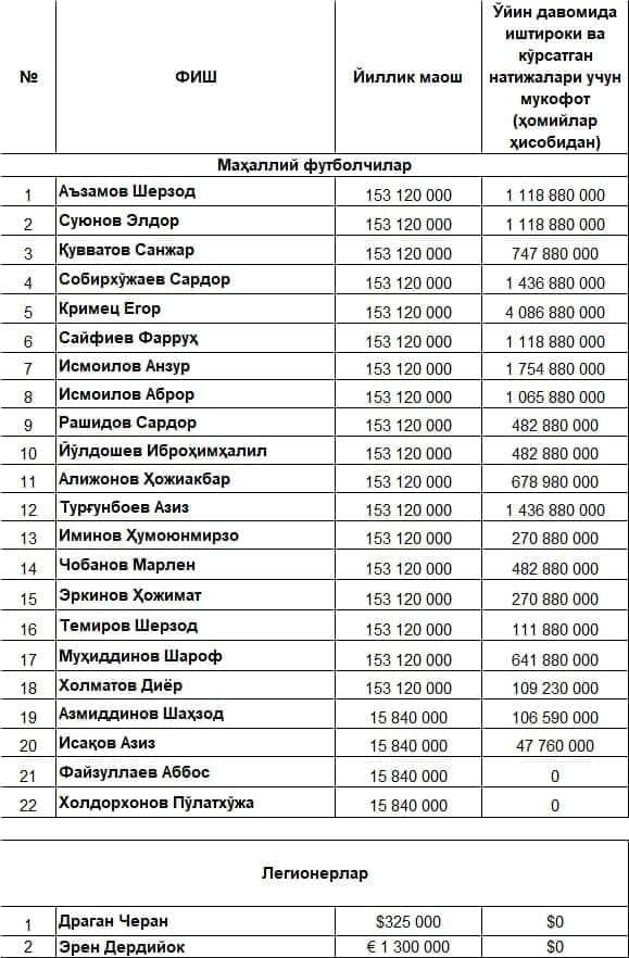 Сразу после этого «Пахтакор» опубликовал информацию о зарплатах и других доходах игроков и тренеров. Выяснилось, что почти все игроки (18 из 21) получают в год 153,1 млн сумов. Легионеры получают в иностранной валюте — Драган Черан — $325 000, а Эрен Дирдийок — 1,3 млн евро.