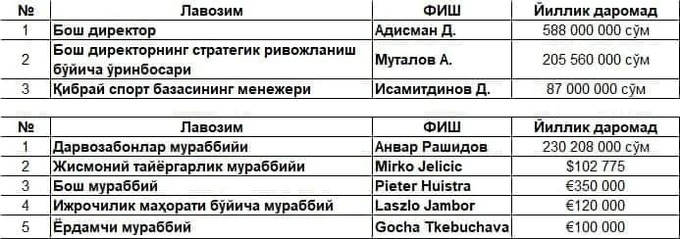 Генеральный директор клуба Дмитрий Адисман получает 588 млн сумов в год, главный тренер Питер Хюистра — 350 тыс. евро, тренер вратарей Анвар Рашидов — 230,2 млн сумов в год: