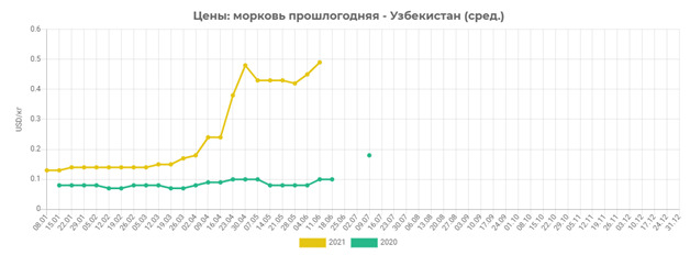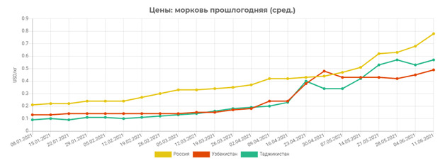 Поведение цен на морковь в Узбекистане целом повторяет динамику цен на этот продукт на основном экспортном рынке сбыта плодоовощной продукции — в России, а также в соседнем Таджикистане: