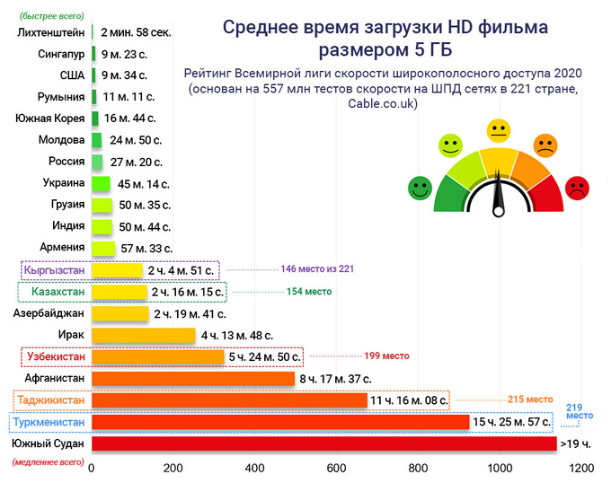 Все центральноазиатские страны находятся в хвосте глобального рейтинга по средней скорости загрузки пяти гигабайт фильма или трех часов образовательной лекции на YouTube в формате Full HD (1080p):