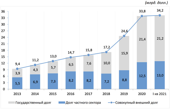 Внешний долг состоит из государственного и частного. Первый составил $21,2 млрд и снизился на $156,7 млн, второй составил $13 млрд и вырос на $467,3 млн.