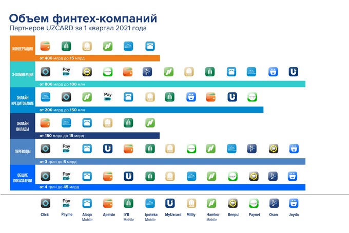 Так, первое место по конвертации занял Apelsin. В первой пятерке IYB Mobile, NBU, Hamkor Mobile и Ipoteka Mobile. В квартал проводится до 400 млрд онлайн-обмена: