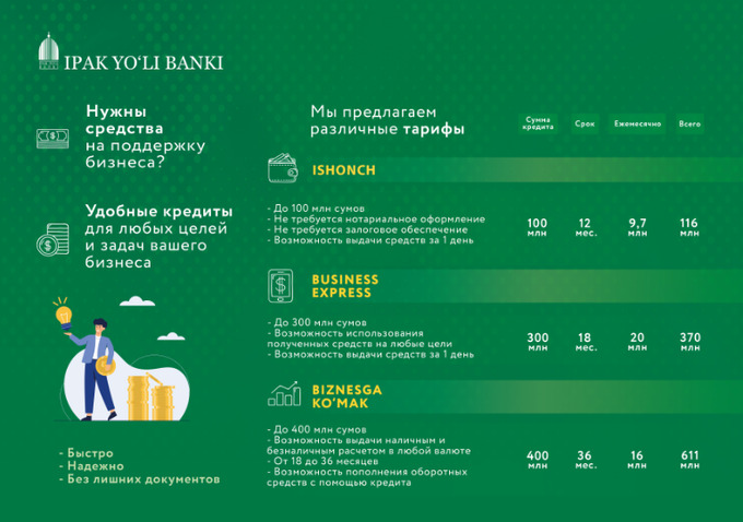Кредиты для развития малого бизнеса — классический продукт банка, который соответствует запросам большинства предпринимателей при обращении в «Ипак Йули». Сумма кредита — до 3 млрд сумов в национальной или иностранной валюте.