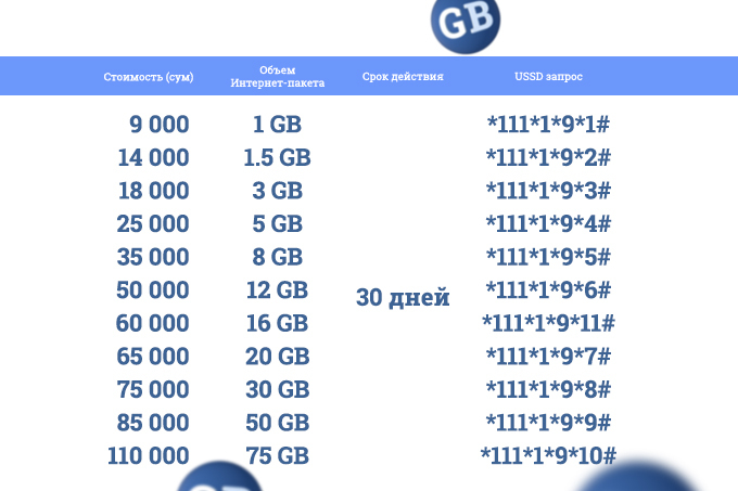 Цены стали еще приятнее и выгоднее. Обновленная линейка интернет-пакетов теперь вобрала в себя 11 опций с разным объемом трафика от 1 до 75 ГБ стоимостью от 9 тысяч до 110 тысяч сумов. Отныне каждая покупка интернет-пакетов будет еще выгоднее и привлекательнее за счет приобретения гигабайтов трафика по цене привычных мегабайтов.