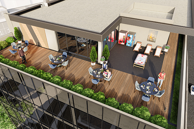 Первый, второй и цокольный этажи бизнес-центра предназначены под торговые площади. Также имеется помещение под ресторан с собственной террасой на восьмом этаже здания.