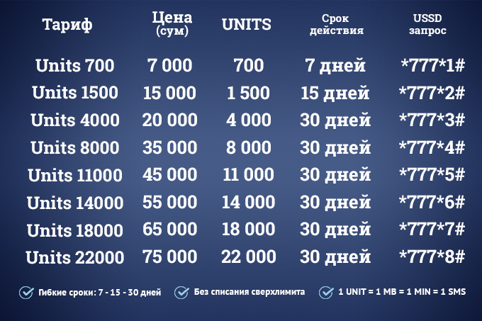 UNITS предлагает абонентам самостоятельно определять свои ресурсы, исходя из простого расчета: 1 Unit = 1 МБ, 1 минута или 1 SMS. Вся линейка включает в себя восемь тарифных планов стоимостью от 7 тысяч до 75 тысяч сумов сроком от 7 до 30 дней.