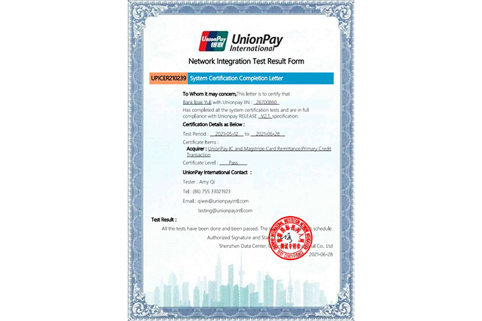 «Ипак Йули» успешно прошел сертификацию международной платежной системы UnionPay International, в результате которой банк готов к запуску услуги международных переводов UnionPay Money Express.