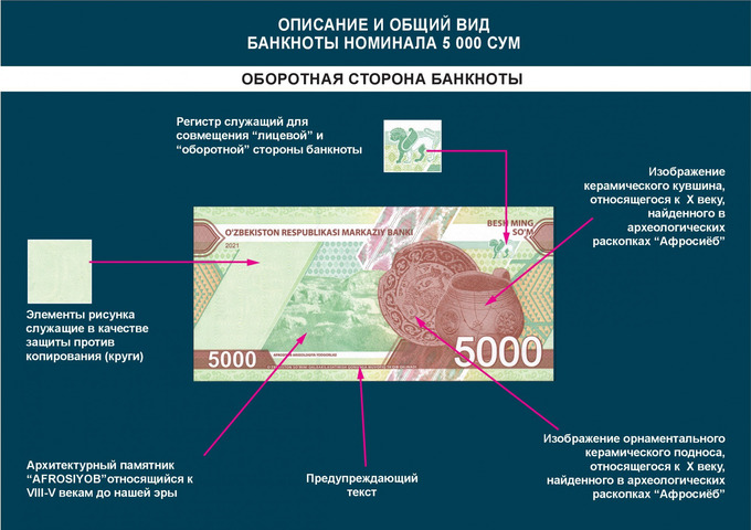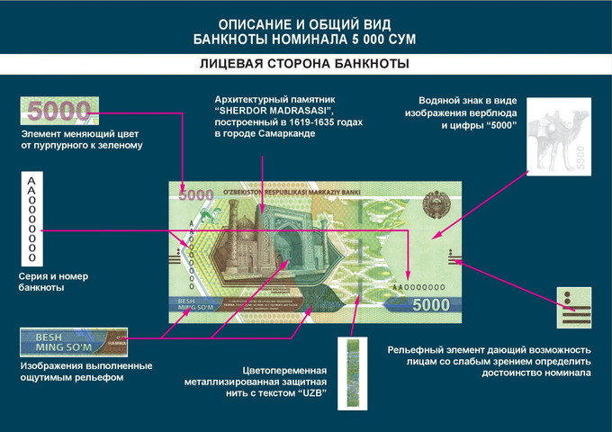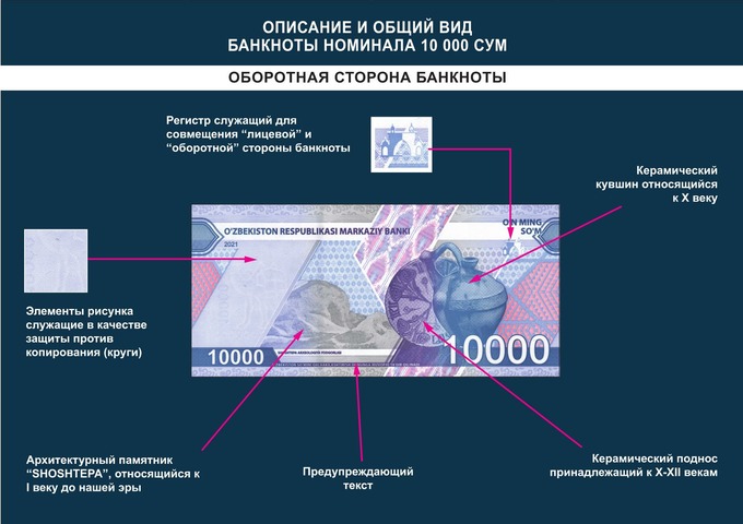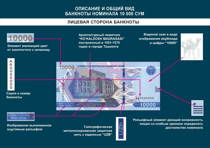 C 26 августа Центральный банк выпускает в обращение новые банкноты достоинством 5 000 и 10 000 сумов. Об этом сообщила пресс-служба регулятора. Тематика новых банкнот посвящена Великому Шелковому Пути, истории Самарканда и Ташкента.
