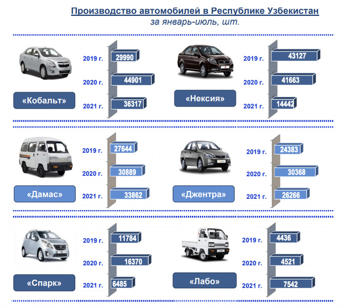В этом году, по сравнению с 2020 годом, сократилось производство практически всех моделей, особенно сильно это коснулось Spark — спад почти на 40%. Исключением стали только Damas и Labo.