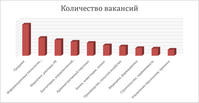 Первое место с большим отрывом занимают «Продажи». На втором месте «Информационные технологии, интернет, телекоммуникации», третьем — «Маркетинг, реклама, PR»: