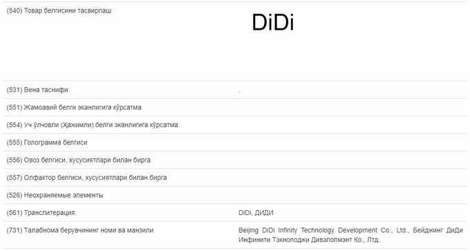 Beijing DiDi Infinity Technology Development Co., Ltd. подала заявку на регистрацию товарного знака DiDi в Узбекистане, следует из данных системы «Интеллектуал мулк» Агентства по интеллектуальной собственности.