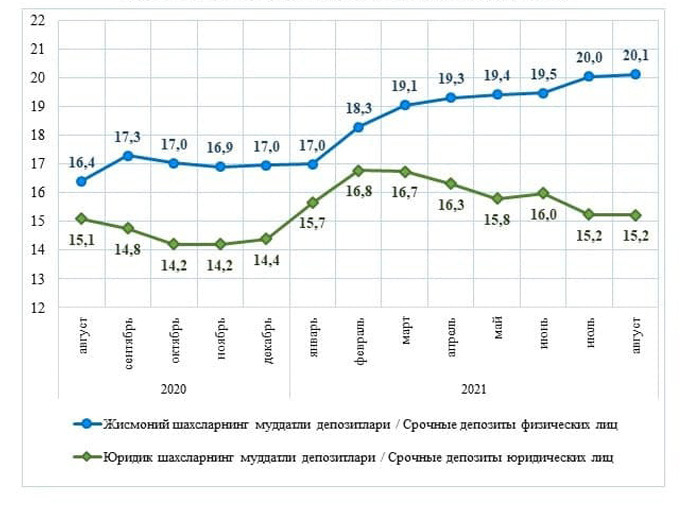 В августе средняя ставка по банковским вкладам для населения в национальной валюте достигла 20,1%. следует из данных, опубликованных Центробанком.