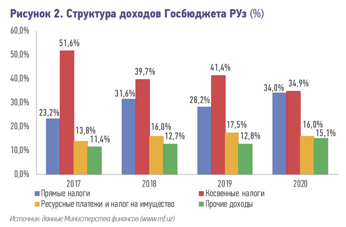 В 2017 году косвенные налоги составляли свыше половины бюджета Узбекистана, прямые — 23,2%. Тремя годами позже их доли практически сравнялись — на прямые налоги пришлось 34% бюджета, на косвенные — 34,9%.