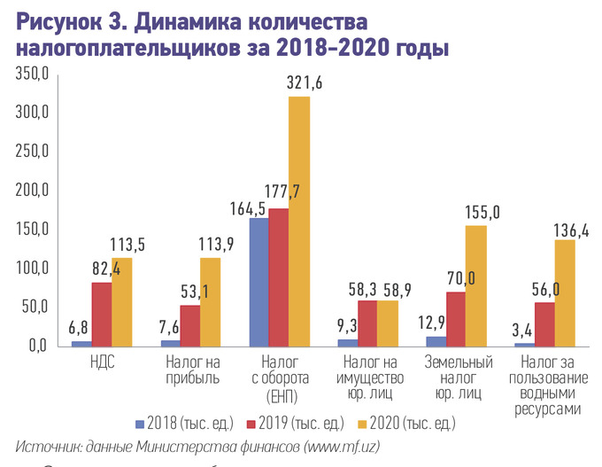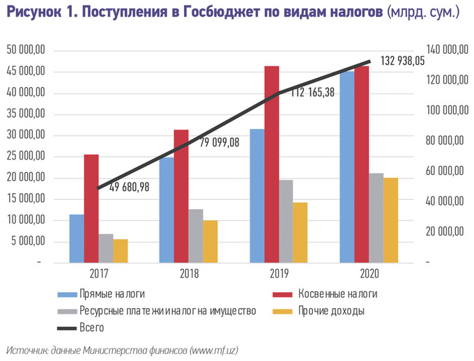 Отчёты Минфина и Госкомстата зафиксировали увеличение налоговых поступлений в госбюджет в 2,6 раза — с 49,68 млрд сумов в 2017 году до 132,93 млрд сумов в 2020.