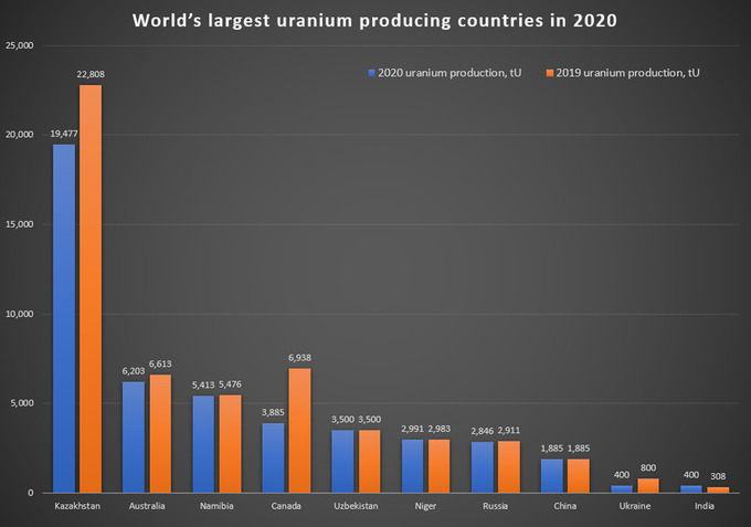 Всего в мире в прошлом году было добыто 47,73 тыс. тонн урана — на 13% меньше уровня 2019 года.
