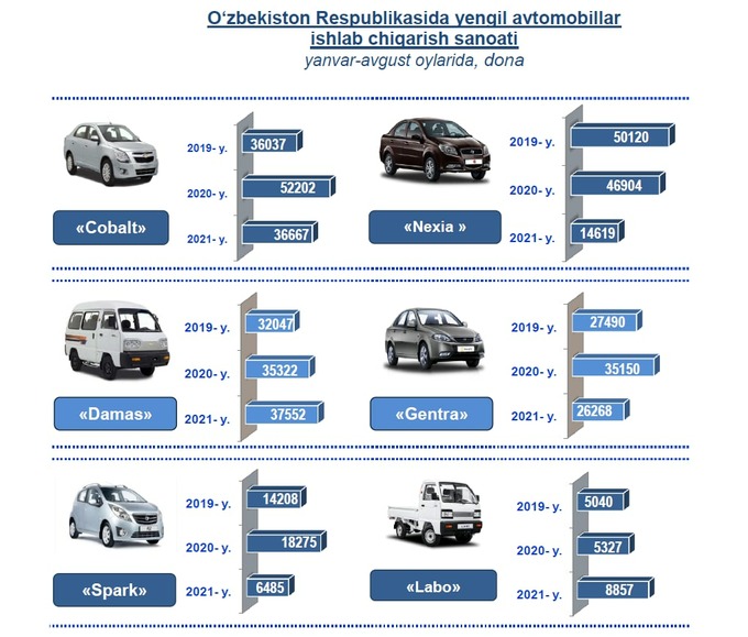 За первые восемь месяцев 2020 года производство Chevrolet Nexia снизилось по сравнению с аналогичным периодом прошлого года в 3 раза, Spark — 2,8 раза.