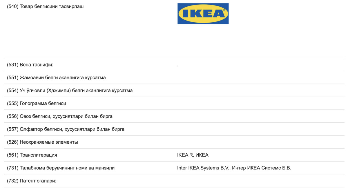 Inter IKEA Systems B.V. подала заявку на регистрацию товарного знака IKEA в Узбекистане, следует из данных системы «Интеллектуал мулк» Агентства по интеллектуальной собственности.