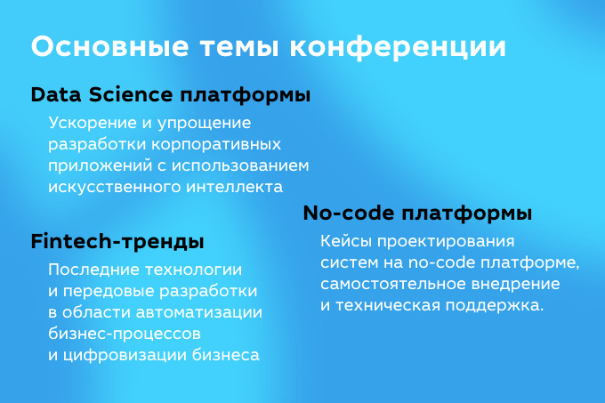 Спикерами станут эксперты банковского и IT-бизнеса из России, Казахстана и Узбекистана. Они поделятся кейсами внедрения систем автоматизации, расскажут про ключевые современные тренды цифровизации с помощью no-code-технологий, представят новые разработки и комплексные решения для fintech-компаний на базе Data Science & Machine Learning.