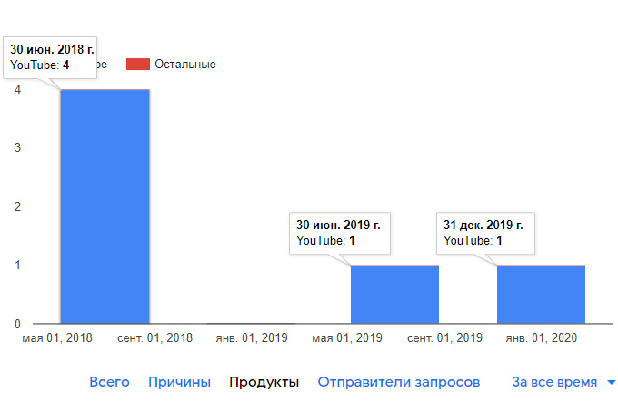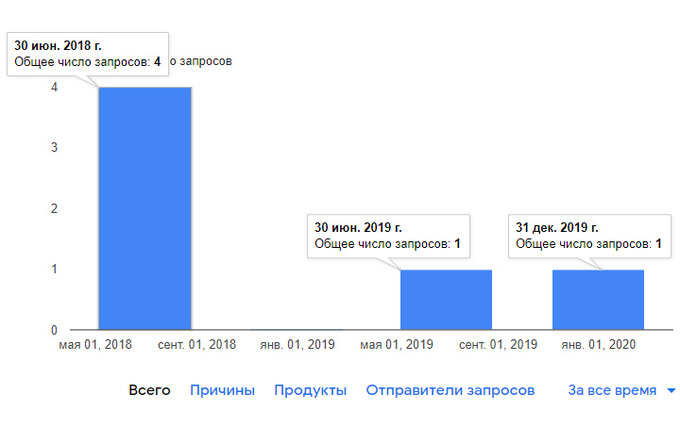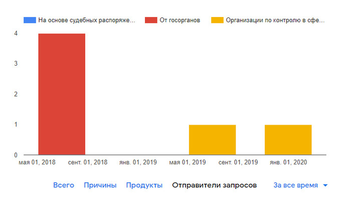 Из них четыре запроса было подано между 1 января и 30 июня 2018 года, ещё по одному — в первом и втором полугодиях 2019 года.