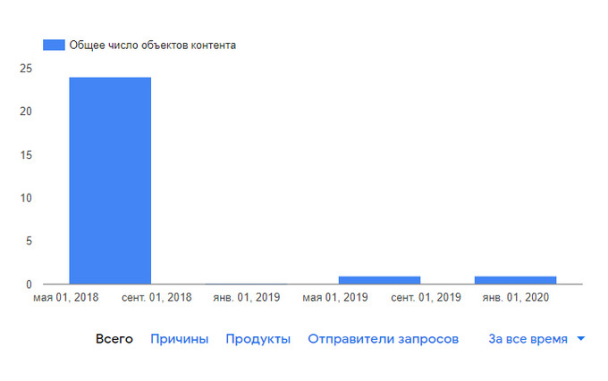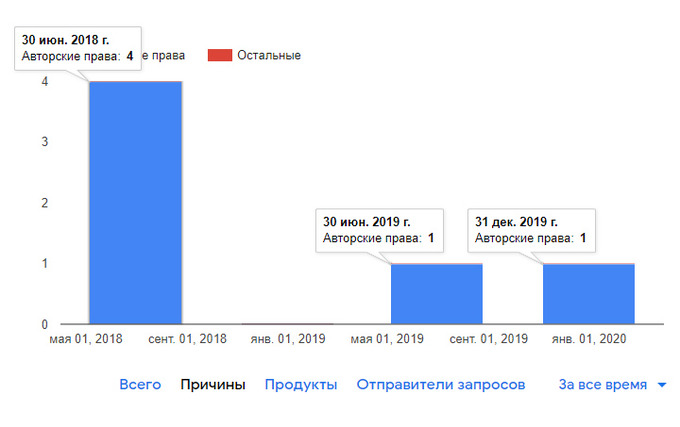 В качестве причины удаления во всех шести случаях указывались нарушения авторских прав.