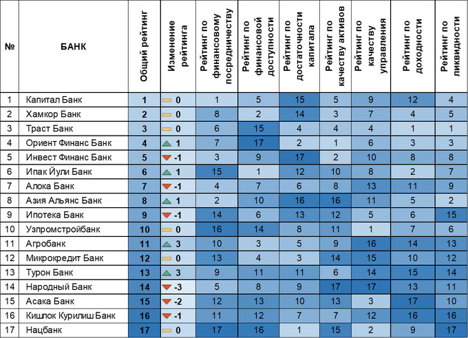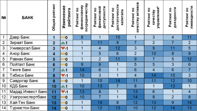 По сравнению с прошлым кварталом значительно понизилась позиция «Халк банка» — он занял 14-ю строчку. С другой стороны, «Агробанк» и «Туронбанк» улучшили свои показатели на три позиции каждый.