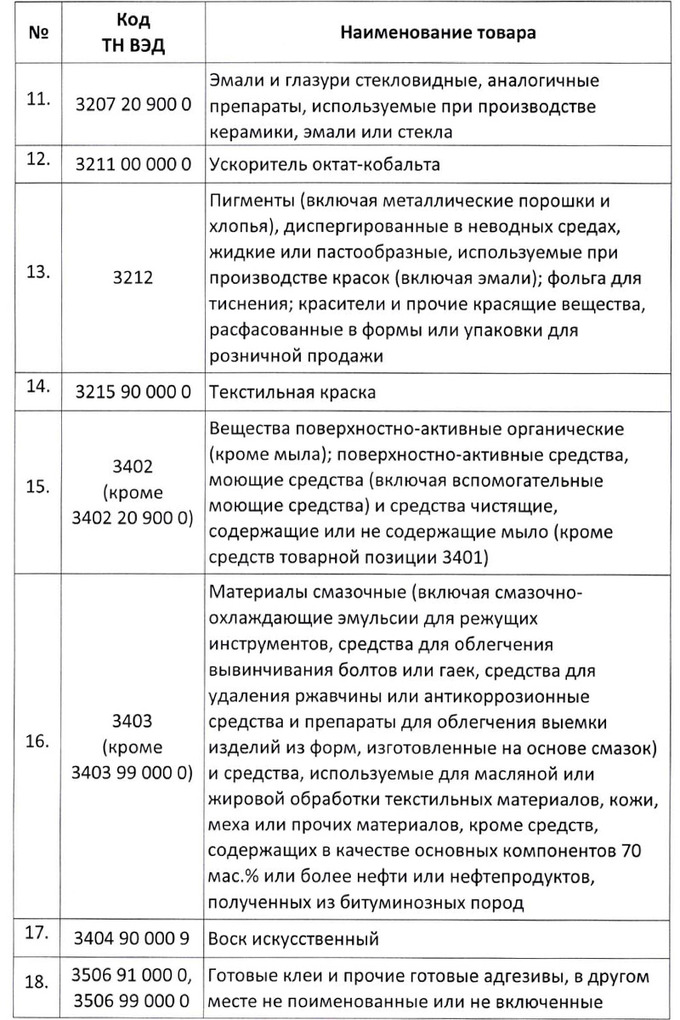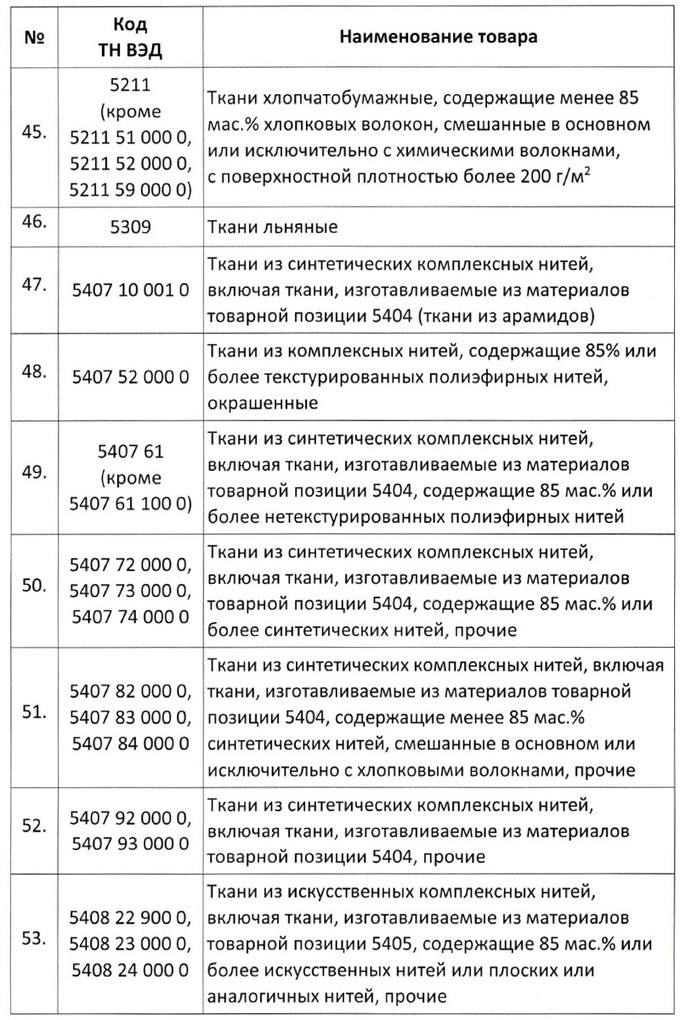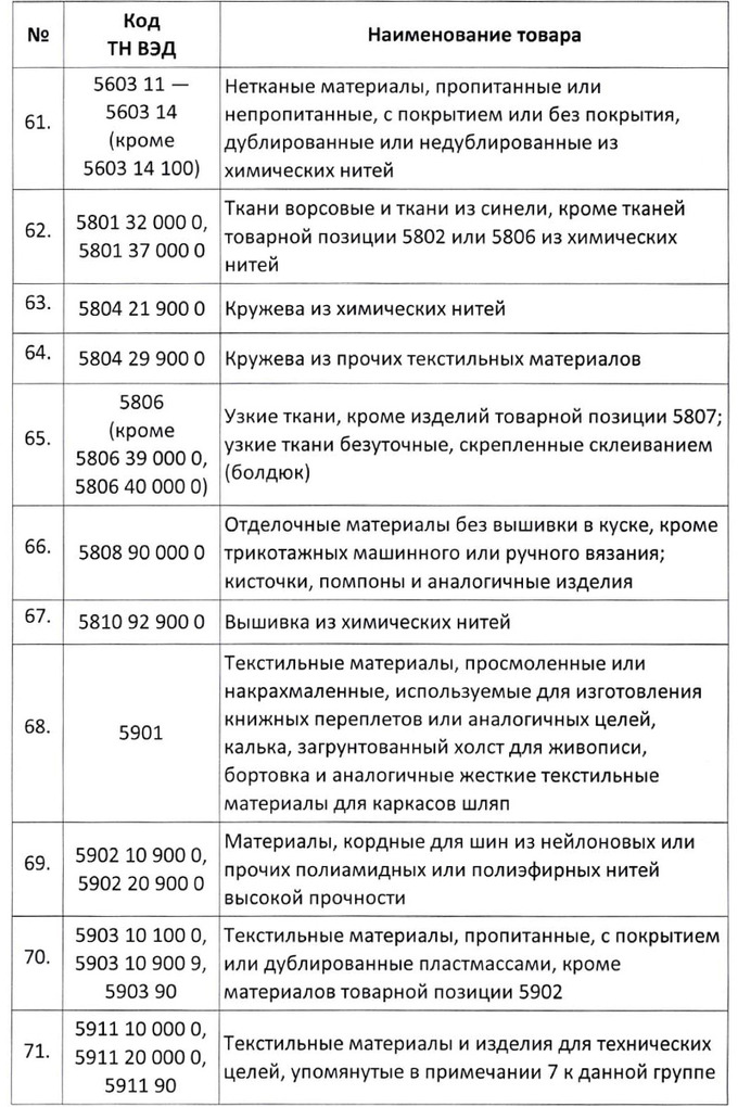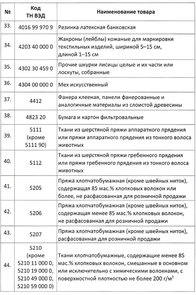 Кроме тканей и материалов для текстильной промышленности, в списке есть самые разные виды товаров — от касторового масла и химического сырья до ферментов и смол, от фанеры и ДСП до батареек, первичных элементов и частей для зажигалок (кроме сигаретных).
