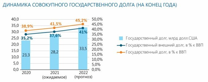 В этом году прогнозируется уровень общего госдолга в $28,2 млрд. По отношению к объёму экономики он составит 41,5% ВВП — это несколько ниже ожидавшихся в прошлом году 44,5% за счёт быстро восстановившейся экономики.