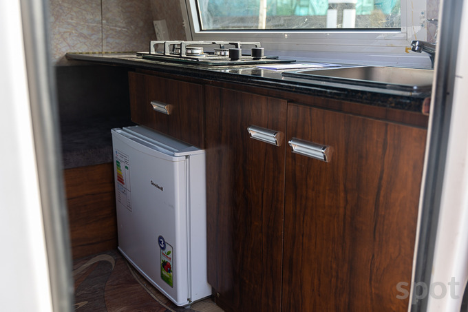 Перед тем как зайти в павильон внимание гостей привлек передвижной цельный 450 килограммовый прицеп от местного производителя Karvon. Он выступает в качестве мини-дома и совмещает в себе спальню и кухню — раздвижная кровать, газовая плита, холодильник и 90 литровый водяной накопитель.