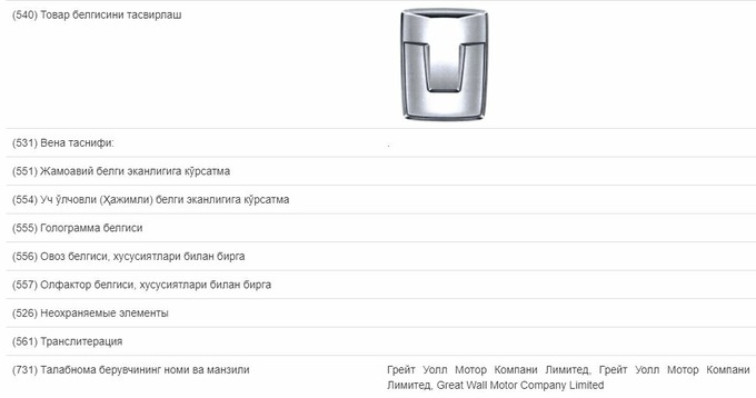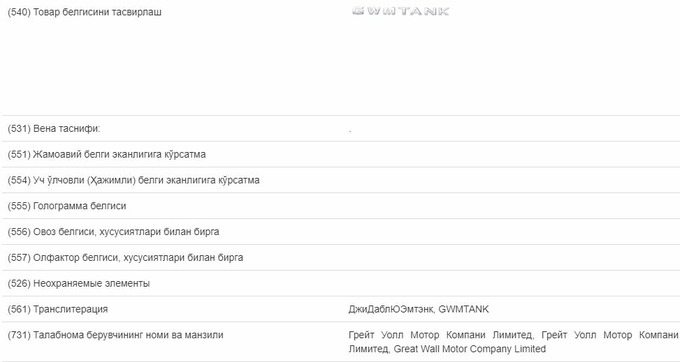 Great Wall Motor Company Limited подала заявку на регистрацию в Узбекистане товарного знака GWMTANK, следует из данных системы «Интеллектуал мулк» Агентства по интеллектуальной собственности.