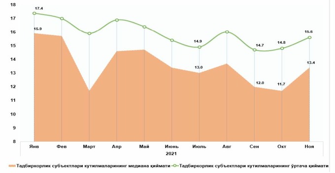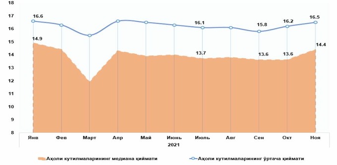 Медианный уровень ожидаемой инфляции среди граждан в прошлом месяце составил 14,4%. В течение нескольких предыдущих месяцев он был относительно стабилен — около 13,6%. Средний уровень вырос с октябрьских 16,2% до 16,5%.
