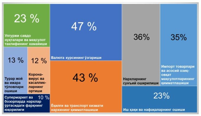 Основными факторами в предполагаемом повышении цен граждане считают: девальвацию сума (47% опрошенных), подорожание топлива и транспорта (43%), подорожание импорта (35%).