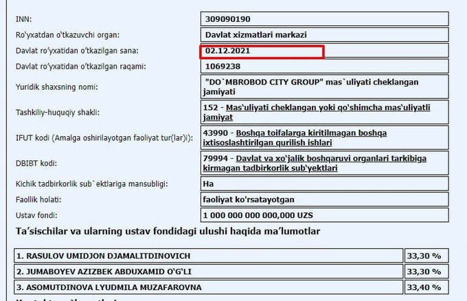 Объект купила компания Do’mbrobod City Group, по данным ЕГРПО учреждённая 2 декабря. Она предложила за лот 266,4 млрд сумов при стартовой цене 204,9 млрд сумов. Торги продлились 1 час 23 минуты.